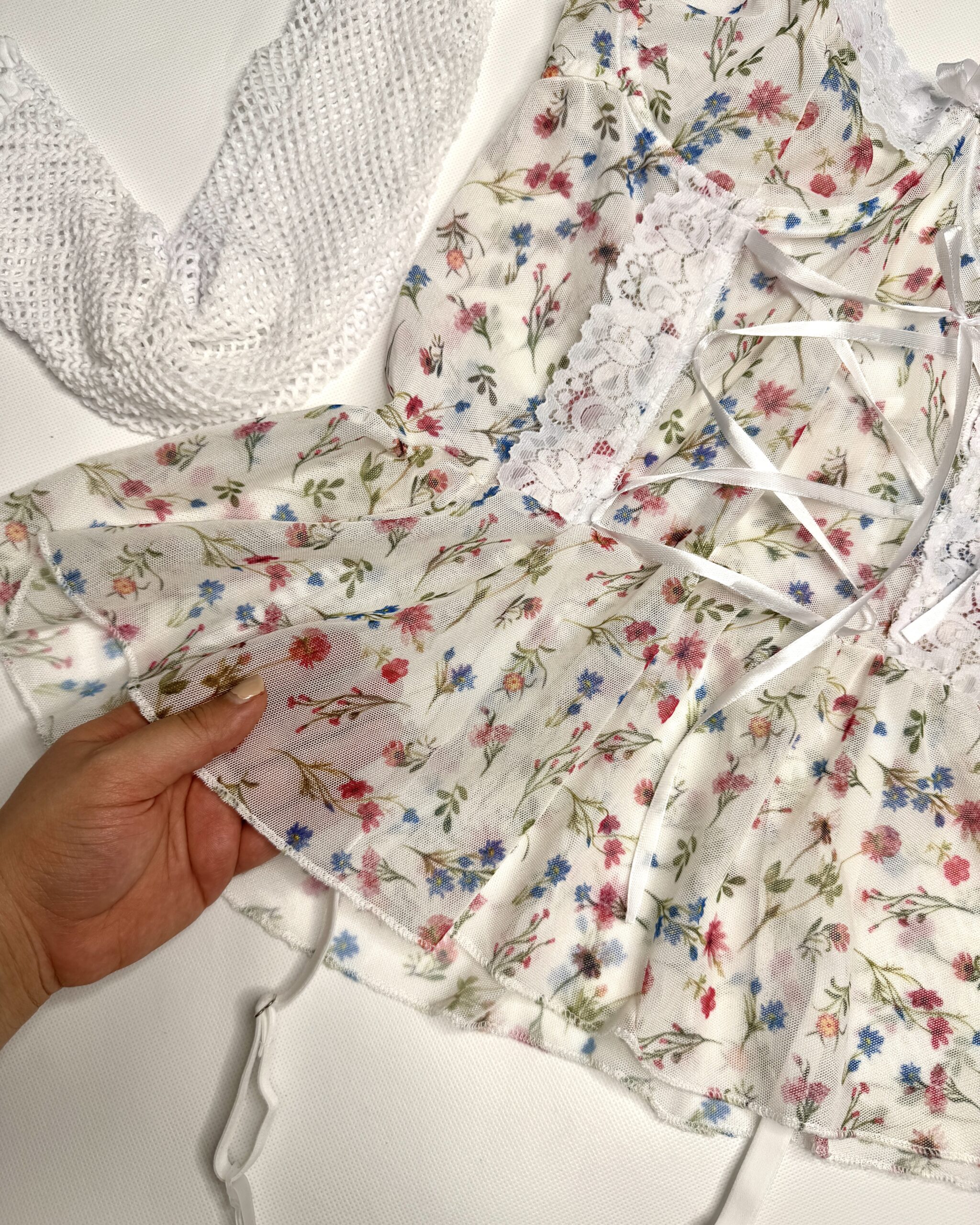 ۴ تیکه است شامل :پیراهن دامنی فنر دار ، شورت لامبادا و یک جفت جوراب سفید زنبوری