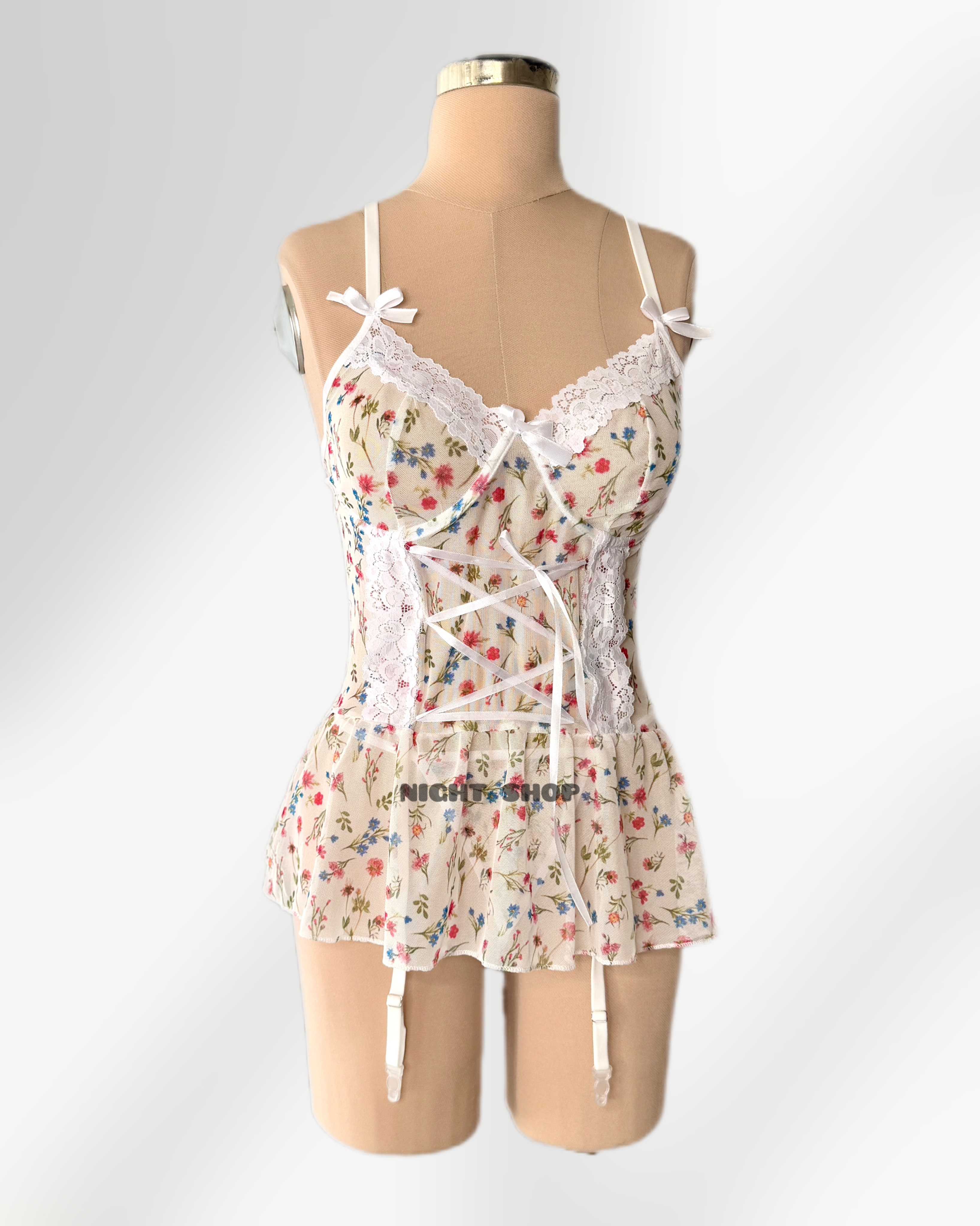 یک جفت گارتر هم به دامن متصله که به جوراب وصل میشه، قسمت سینه از پشت با قزن بسته میشه و بند ها قابل تنظیمن