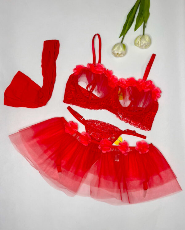 ۵ تیکه است شامل : سوتین فنر دار که قسمت سینه بازه و با دوخت گلدار پوشیده میشه ، دامن توری ، شورت لامبادا و یک جفت جوراب شیشه ای هم رنگ لباس